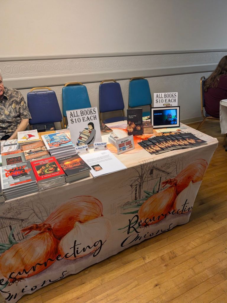 Today, I participated in my first book fair (Hocking Hills Book Fair in Nelsonville, Ohio) promoting my book of poetry, Resurrecting Onions. I had high hopes for the whole event in general, but was cautiously optimistic about my own success. Cautiously was very prophetic.